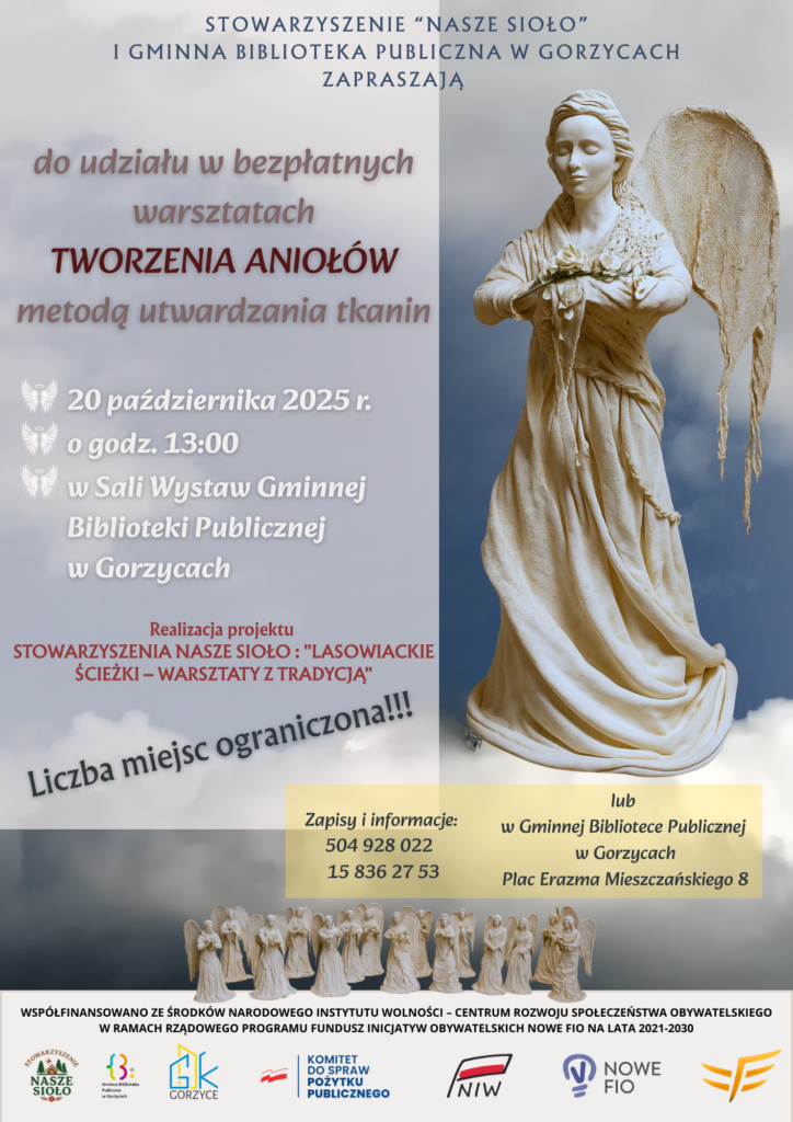 Na początek oferujemy Państwu bezpłatne warsztaty tworzenia aniołów metodą utwardzania tkanin, które poprowadzi p. Joanna Tabor. Jest to realizacja projektu Stowarzyszenia „NASZE SIOŁO” – „LASOWIACKIE ŚCIEŻKI – WARSZTATY Z TRADYCJĄ”.