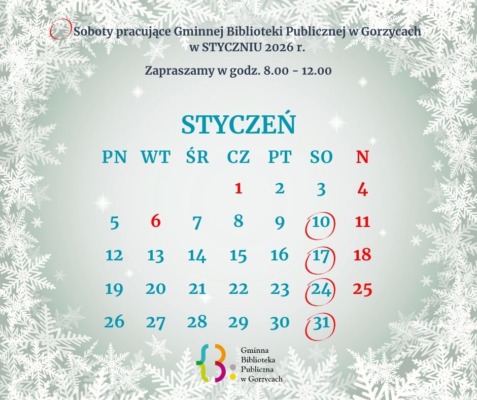 6 lutego 2026 / Last updated : 6 lutego 2026 Bibliotekarz Aktualności SOBOTY PRACUJĄCE GMINNEJ BIBLIOTEKI PUBLICZNEJ W GORZYCACH Zapraszamy w godz. 8.00 – 12.00.