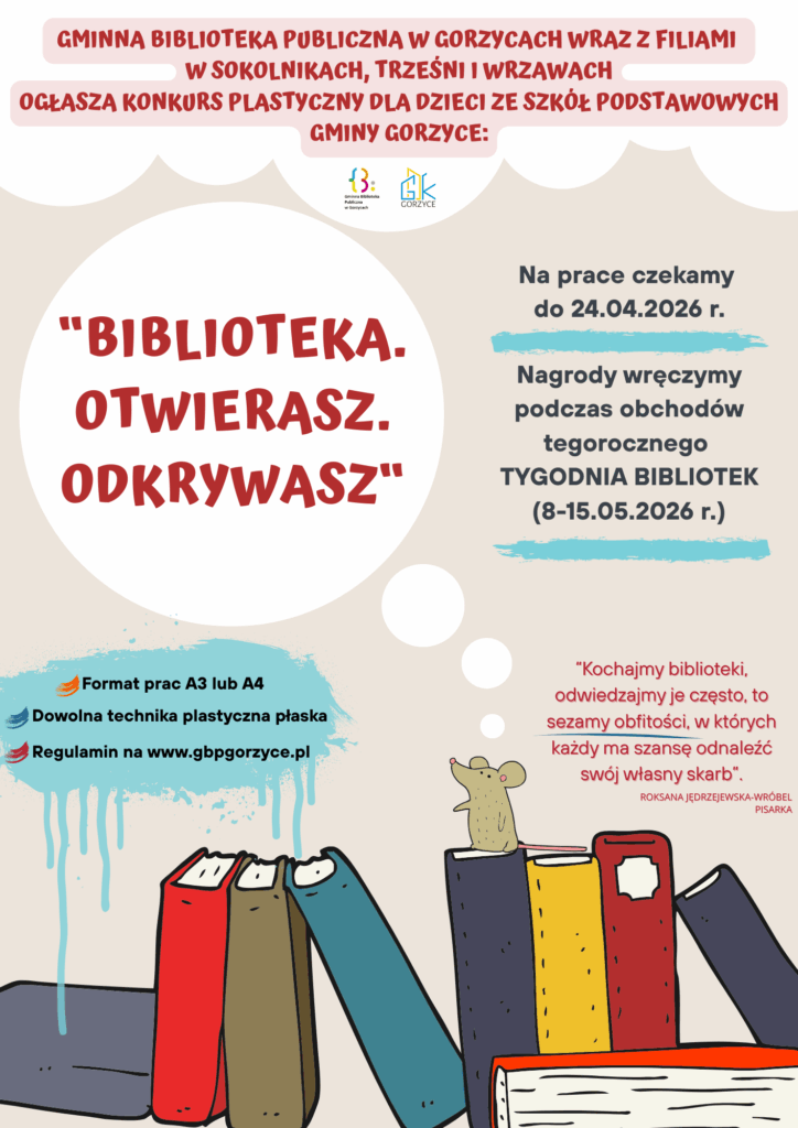 KONKURS PLASTYCZNY „BIBLIOTEKA. OTWIERASZ. ODKRYWASZ” – WSPÓLNA AKCJA GBP GORZYCE I JEJ FILII: W SOKOLNIKACH, TRZEŚNI I WRZAWACH
